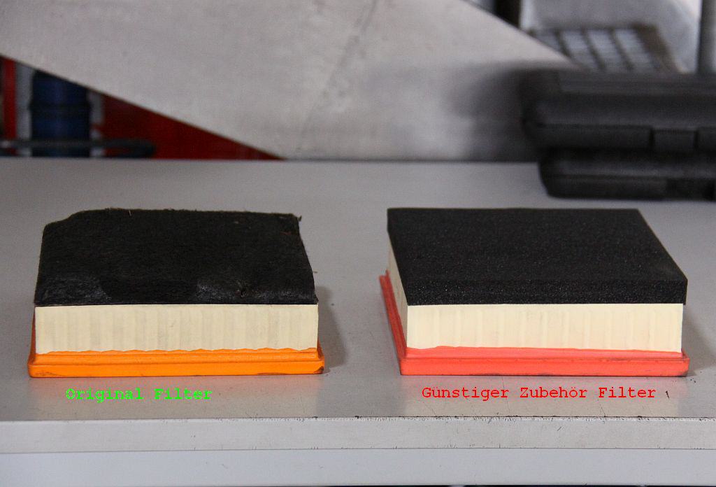 Auf den ersten Blick sehen beide Filter fast gleich aus. Aber der Zubehörfilter hat eine schwarze Abdeckung aus luftundurchlässigem Schaumstoff. Das Oberteil des Original – Filters lässt hingegen Luft durch. Filter getauscht….und siehe da, die Leistung war wieder da. Für den Kunden wäre es am Ende besser / preiswerter gewesen einen originalen Filter zu verbauen, oder uns darüber zu informieren was in der letzten Zeit an dem Fahrzeug gemacht wurde.