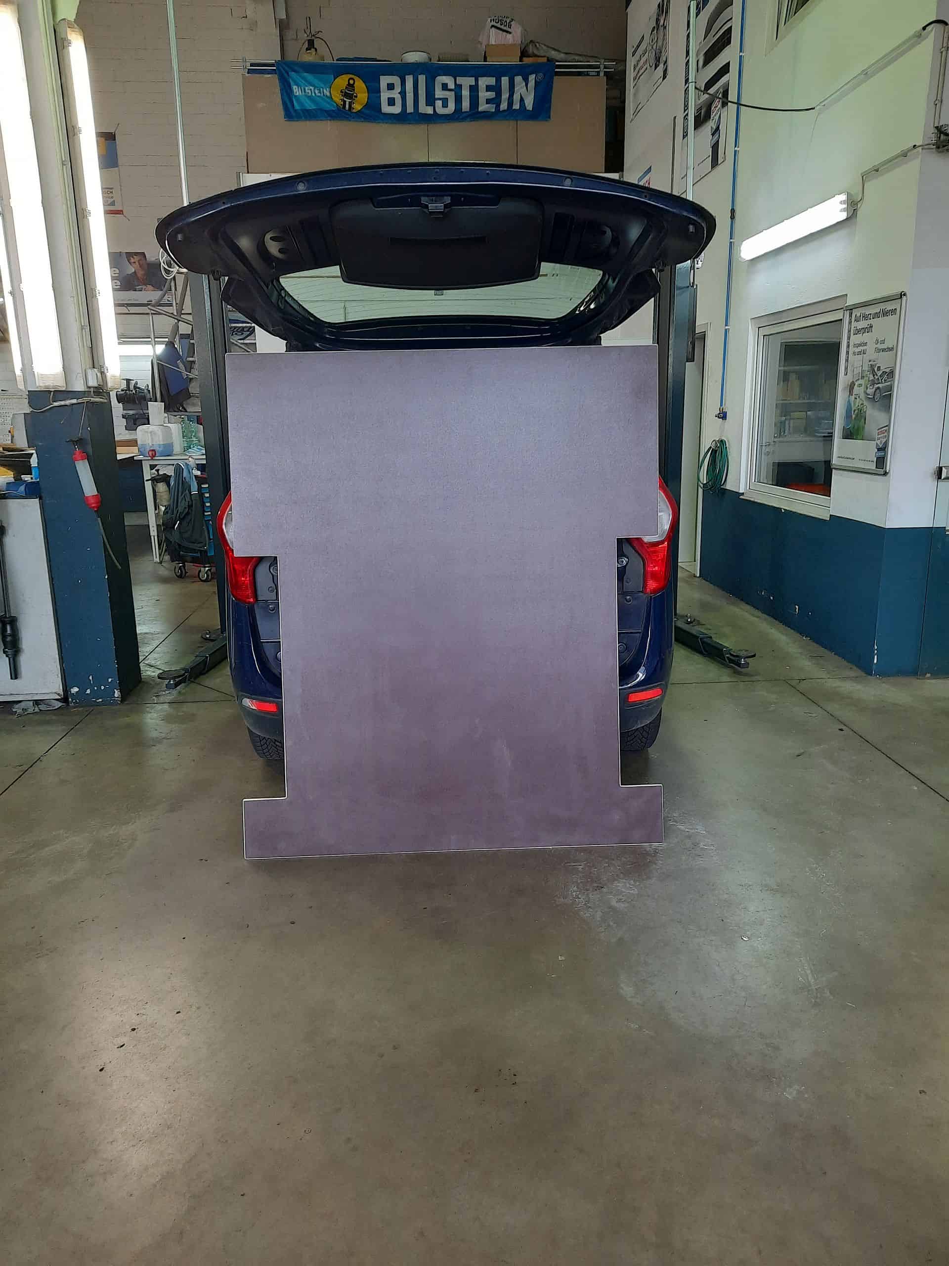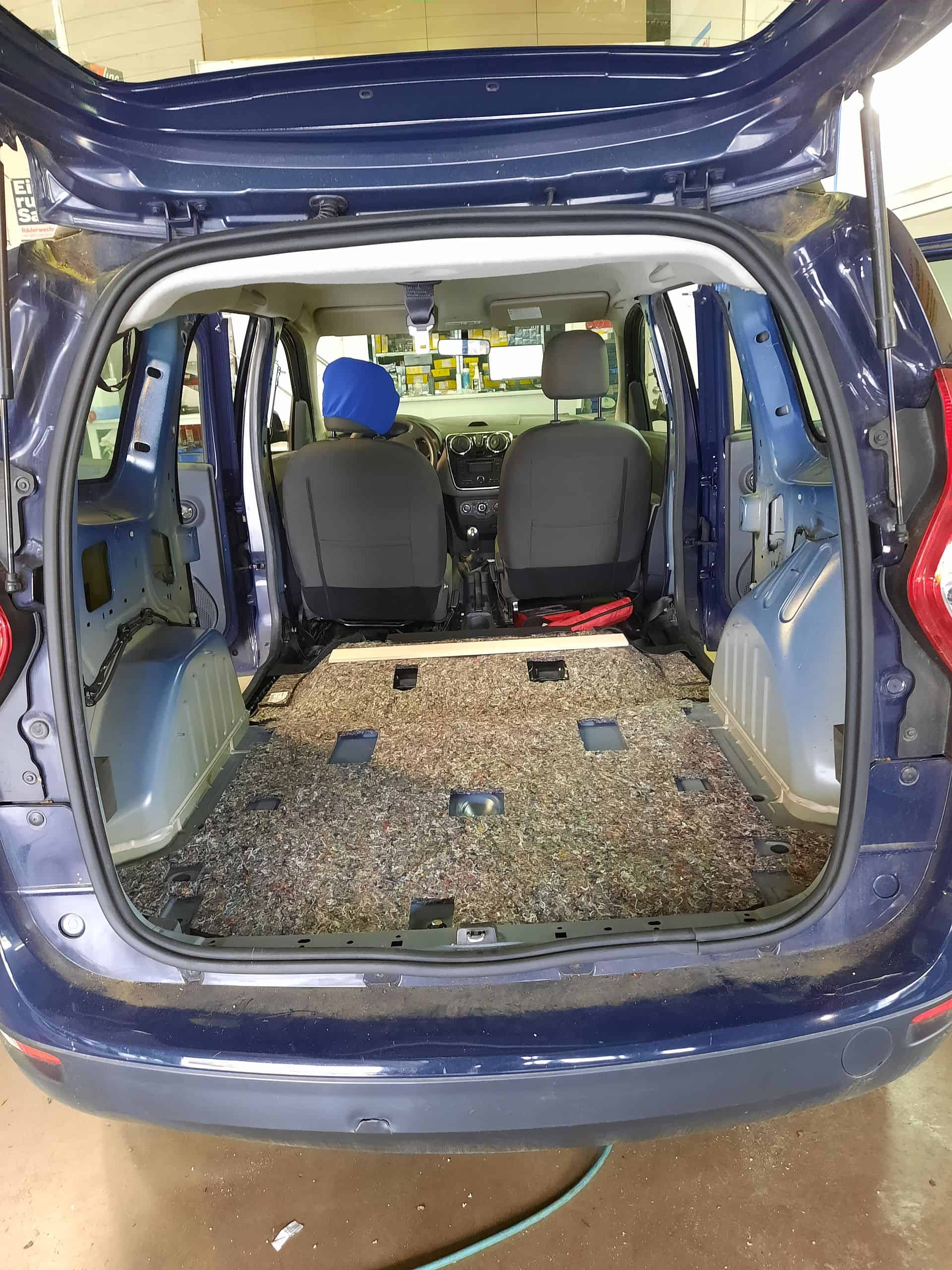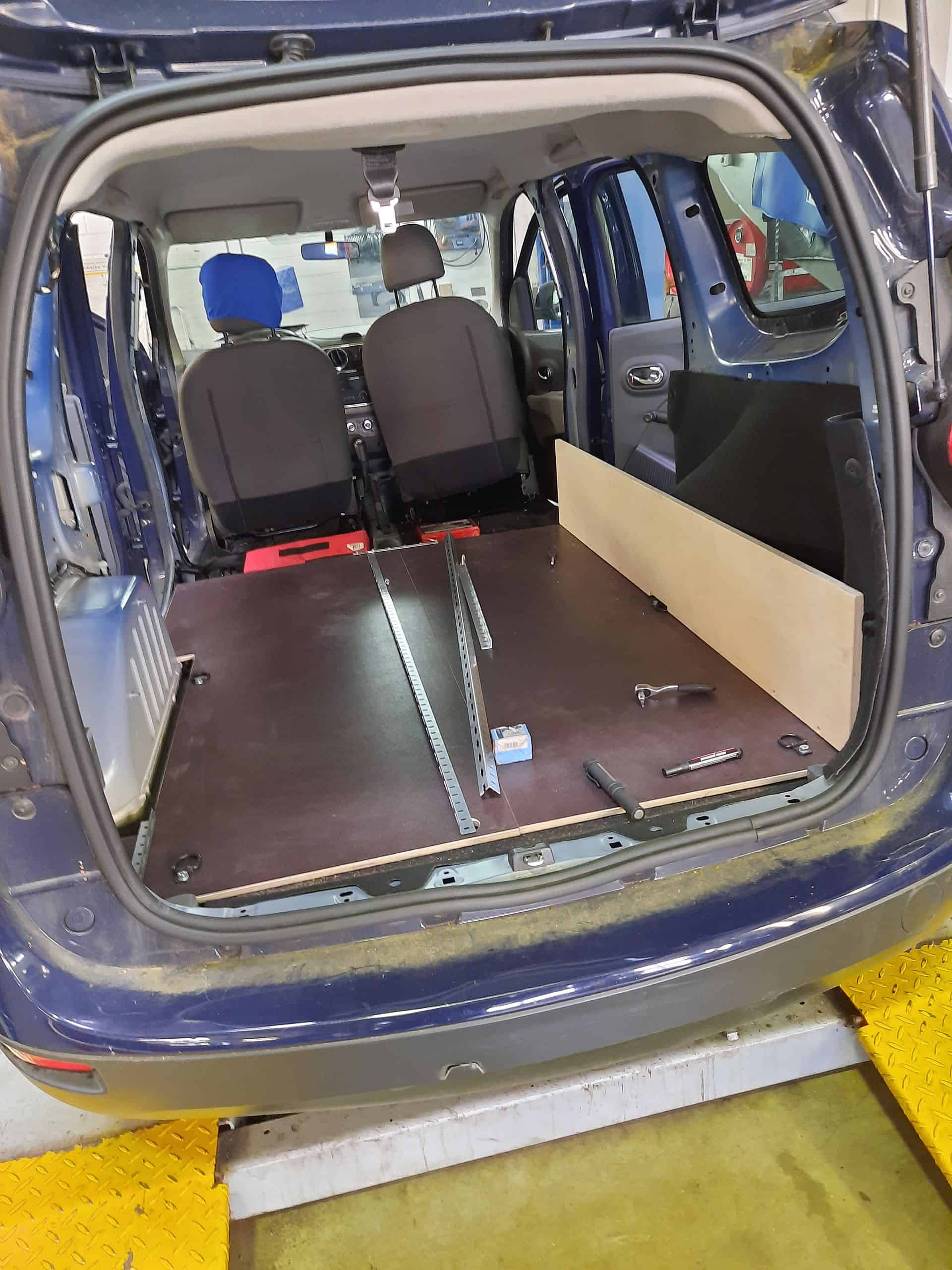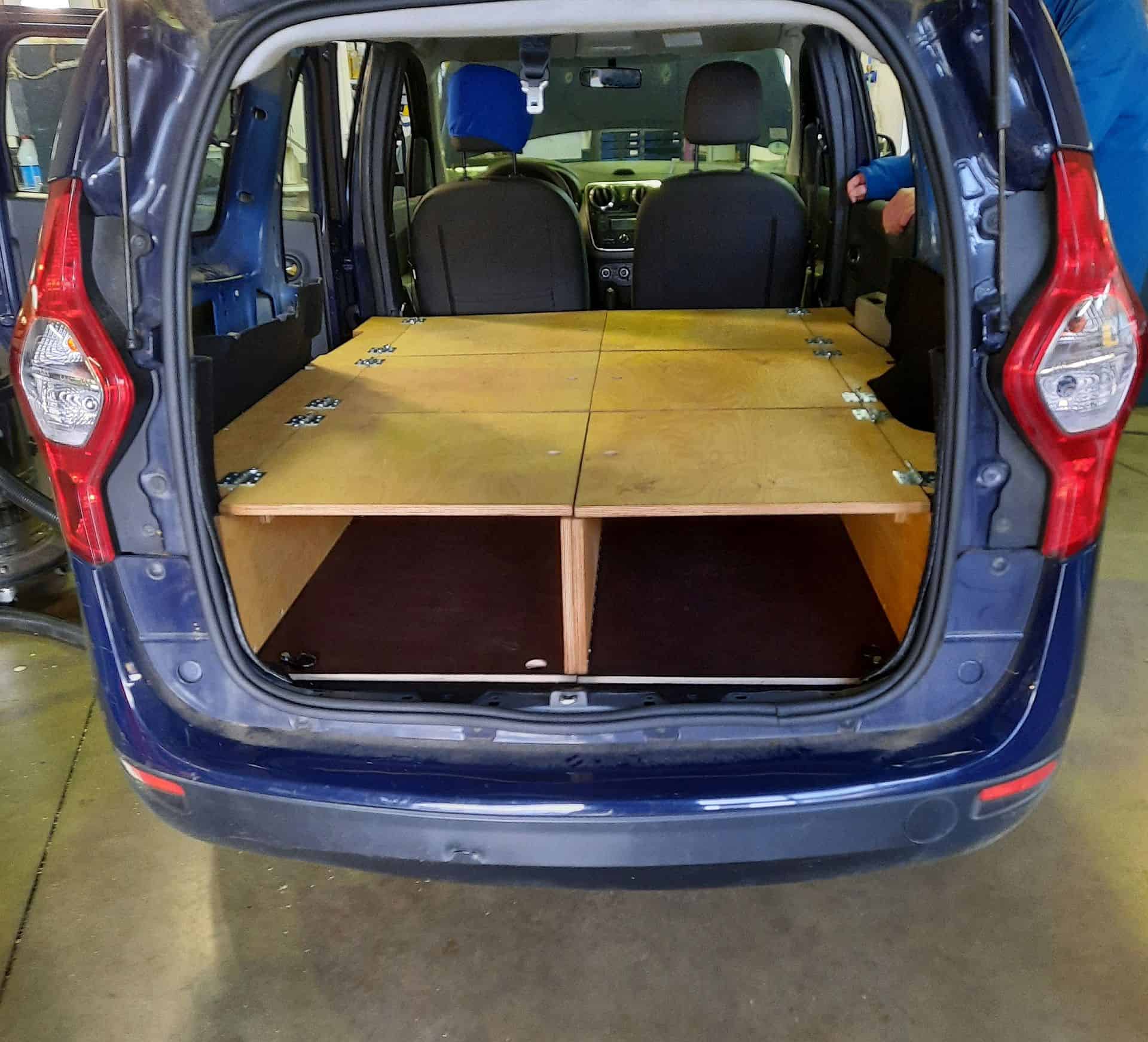Wir haben einen Dacia Lodgy umgebaut. In dem Fahrzeug haben wir eine Liegefläche und darunter Stauraum geschaffen. Zunächst wurde eine Bodenplatte angefertigt und eingebaut um eine ebene Fläche für den weiteren Aufbau zubekommen. Der Unterboden wurde mit einer Dämmung versehen. Dann wurde die Liegefläche aus einzelnen Elementen gebaut. Der Stauraum ist sowohl von hinten als auch von oben zugänglich. Für die Heckklappe haben wir eine Öffnungsmöglichkeit von Innen entwickelt.