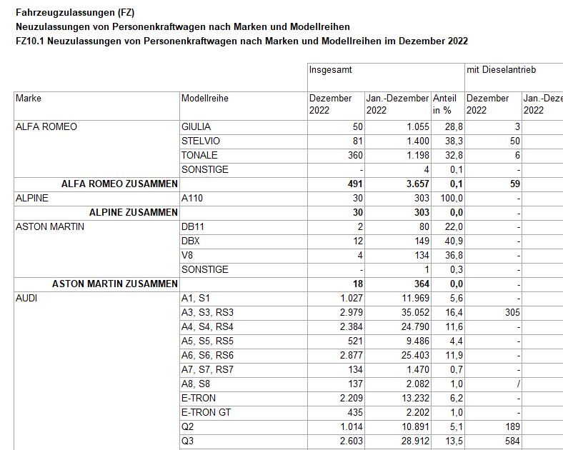Kraftfahrtbundesamt / Excel-Tabelle